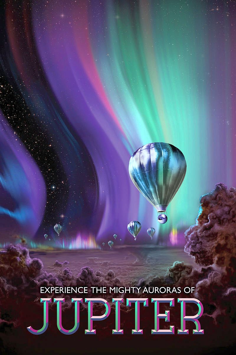 美国太空总署为了全面揭露秘密太空计划,在近期张贴了太空旅游的宣传海报;邀请民众到木星看极光或到土卫二看冰喷泉: