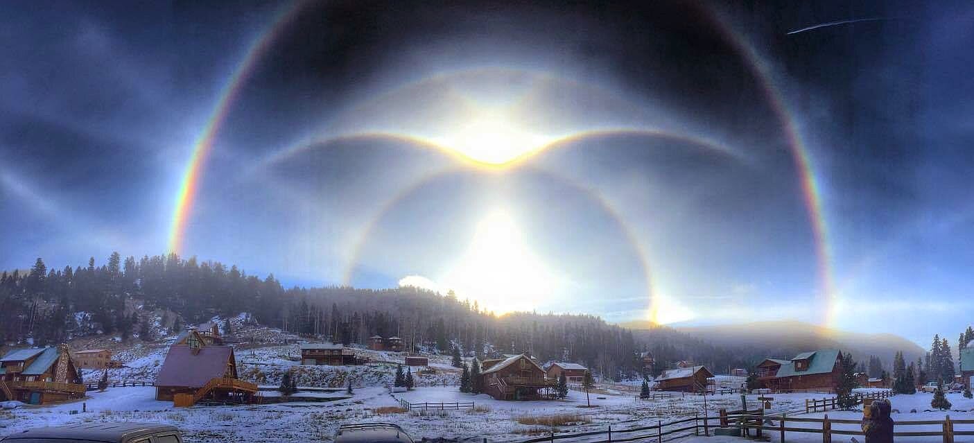 这张照片中同时出现了内晕弭(图中间的光杯)、光柱(光杯底下的杯体)、幻日(两道彩虹右下角的光点)、光晕和另外四种不同的日弧。这些相当罕见的光学现象会同时出现,真的是千百年难得一见。