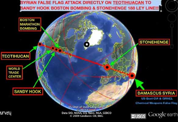 This leyline is also known as the Goddess Leyline. It is the entry point for the Goddess Energy on the planet. The Light Forces are liberating this line from negative events in its vicinity. Locations on this leyline connected to important vortex points on this planet are for instance: Damascus Syria, Versailles, Stonehenge, Boston (Marathon), New York (WTC, Sandy Hook) and Teotihuacan. War is continually created on this leyline by the archons.