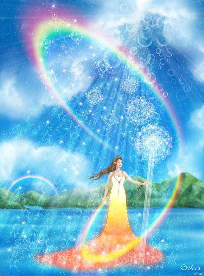 5. 旋转的同时唱诵iiii(发音ee-ee),让咒音的震动传遍全身。观想你的身体逐渐化为一道明亮的光柱,在光柱中散布着数百万颗彩虹光彩的星光。