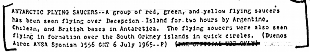 "ANTARCTIC FLYING SAUCERS" - 一群红色,绿色和黄色的飞碟被阿根廷,智利和英国的基地(军事)在南极飞过欺骗岛两小时。飞碟也被看到在南奥克尼群岛的快速圈中飞行。"